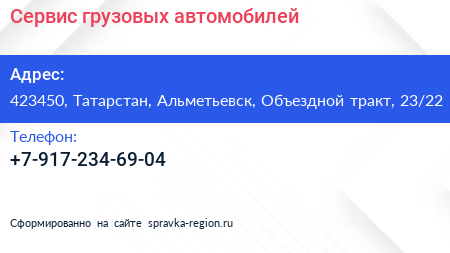 Сервис грузовых автомобилей по адресу 423450, Татарстан, Альметьевск, Объездной тракт, 23/22 в дальнейшем Организация, размещена в следующих категориях: