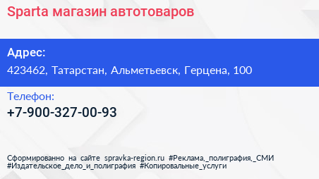 Sparta, магазин автотоваров по адресу 423462, Татарстан, Альметьевск, Герцена, 100 в дальнейшем Организация, размещена в следующих категориях: