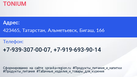 TONIUM по адресу 423465, Татарстан, Альметьевск, Бигаш, 166 в дальнейшем Организация, размещена в следующих категориях: