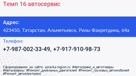Темп 16, автосервис по адресу 423450, Татарстан, Альметьевск, Ризы Фахретдина, 64а в дальнейшем Организация, размещена в следующих категориях: