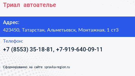 Триал+, автоателье по адресу 423450, Татарстан, Альметьевск, Монтажная, 1 ст3 в дальнейшем Организация, размещена в следующих категориях: