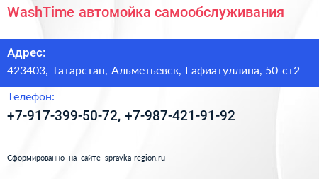 WashTime, автомойка самообслуживания по адресу 423403, Татарстан, Альметьевск, Гафиатуллина, 50 ст2 в дальнейшем Организация, размещена в следующих категориях: