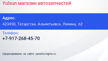Yulsun, магазин автозапчастей по адресу 423450, Татарстан, Альметьевск, Ленина, 62 в дальнейшем Организация, размещена в следующих категориях: