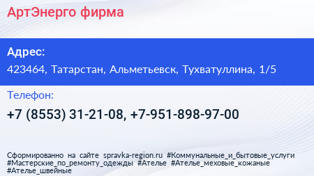 АртЭнерго, фирма по адресу 423464, Татарстан, Альметьевск, Тухватуллина, 1/5 в дальнейшем Организация, размещена в следующих категориях: