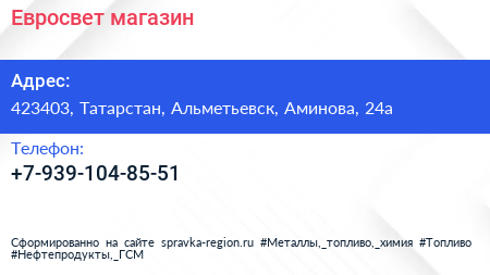 Евросвет, магазин по адресу 423403, Татарстан, Альметьевск, Аминова, 24а в дальнейшем Организация, размещена в следующих категориях: