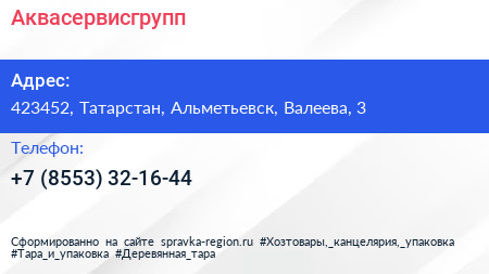 Аквасервисгрупп по адресу 423452, Татарстан, Альметьевск, Валеева, 3 в дальнейшем Организация, размещена в следующих категориях: