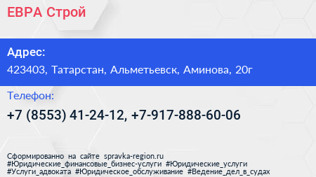 ЕВРА-Строй по адресу 423403, Татарстан, Альметьевск, Аминова, 20г в дальнейшем Организация, размещена в следующих категориях:
