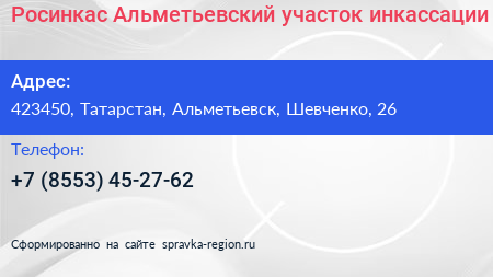 Росинкас, Альметьевский участок инкассации по адресу 423450, Татарстан, Альметьевск, Шевченко, 26 в дальнейшем Организация, размещена в следующих категориях: