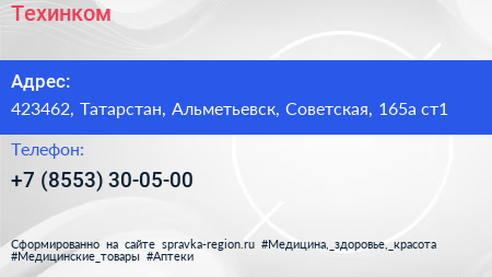 Техинком по адресу 423462, Татарстан, Альметьевск, Советская, 165а ст1 в дальнейшем Организация, размещена в следующих категориях: