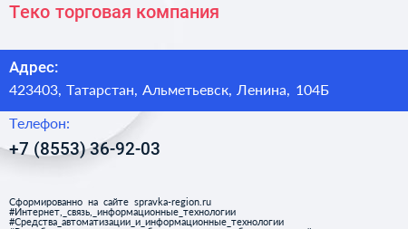 Теко, торговая компания по адресу 423403, Татарстан, Альметьевск, Ленина, 104Б в дальнейшем Организация, размещена в следующих категориях: