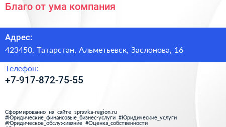 Благо от ума, компания по адресу 423450, Татарстан, Альметьевск, Заслонова, 16 в дальнейшем Организация, размещена в следующих категориях: