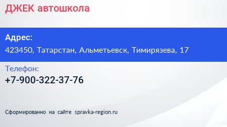 ДЖЕК, автошкола по адресу 423450, Татарстан, Альметьевск, Тимирязева, 17 в дальнейшем Организация, размещена в следующих категориях: