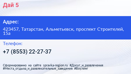 Дай 5 по адресу 423457, Татарстан, Альметьевск, проспект Строителей, 15а в дальнейшем Организация, размещена в следующих категориях: