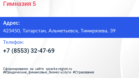 Гимназия №5 по адресу 423450, Татарстан, Альметьевск, Тимирязева, 39 в дальнейшем Организация, размещена в следующих категориях: