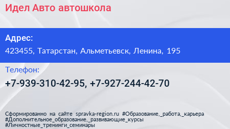 Идел-Авто, автошкола по адресу 423455, Татарстан, Альметьевск, Ленина, 195 в дальнейшем Организация, размещена в следующих категориях: