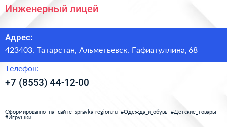 Инженерный лицей по адресу 423403, Татарстан, Альметьевск, Гафиатуллина, 68 в дальнейшем Организация, размещена в следующих категориях:
