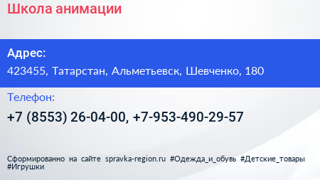 Школа анимации по адресу 423455, Татарстан, Альметьевск, Шевченко, 180 в дальнейшем Организация, размещена в следующих категориях: