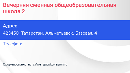 Вечерняя(сменная) общеобразовательная школа № 2 по адресу 423450, Татарстан, Альметьевск, Базовая, 4 в дальнейшем Организация, размещена в следующих категориях: