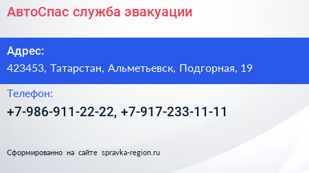 АвтоСпас, служба эвакуации по адресу 423453, Татарстан, Альметьевск, Подгорная, 19 в дальнейшем Организация, размещена в следующих категориях:
