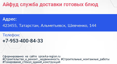 Айфуд, служба доставки готовых блюд по адресу 423455, Татарстан, Альметьевск, Шевченко, 144 в дальнейшем Организация, размещена в следующих категориях: