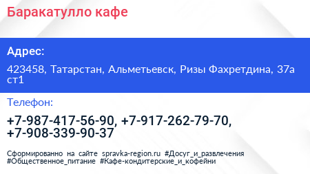 Баракатулло, кафе по адресу 423458, Татарстан, Альметьевск, Ризы Фахретдина, 37а ст1 в дальнейшем Организация, размещена в следующих категориях: