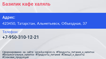 Базилик, кафе-халяль по адресу 423450, Татарстан, Альметьевск, Объездная, 37 в дальнейшем Организация, размещена в следующих категориях: