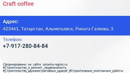 Craft coffee по адресу 423461, Татарстан, Альметьевск, Рината Галеева, 3 в дальнейшем Организация, размещена в следующих категориях: