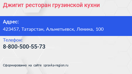 Джигит, ресторан грузинской кухни по адресу 423457, Татарстан, Альметьевск, Ленина, 100 в дальнейшем Организация, размещена в следующих категориях: