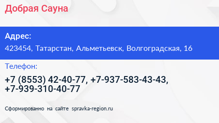 Добрая Сауна по адресу 423454, Татарстан, Альметьевск, Волгоградская, 16 в дальнейшем Организация, размещена в следующих категориях: