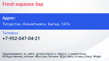 Fresh, караоке-бар по адресу Татарстан, Альметьевск, Бигаш, 147а в дальнейшем Организация, размещена в следующих категориях: