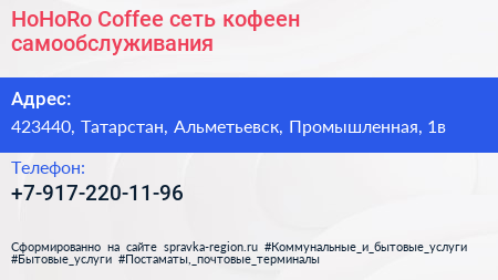 HoHoRo Coffee, сеть кофеен самообслуживания по адресу 423440, Татарстан, Альметьевск, Промышленная, 1в в дальнейшем Организация, размещена в следующих категориях: