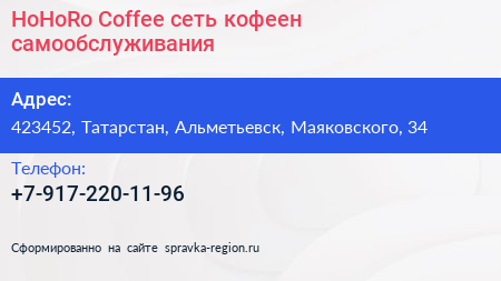 HoHoRo Coffee, сеть кофеен самообслуживания по адресу 423452, Татарстан, Альметьевск, Маяковского, 34 в дальнейшем Организация, размещена в следующих категориях:
