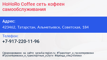 HoHoRo Coffee, сеть кофеен самообслуживания по адресу 423462, Татарстан, Альметьевск, Советская, 184 в дальнейшем Организация, размещена в следующих категориях: