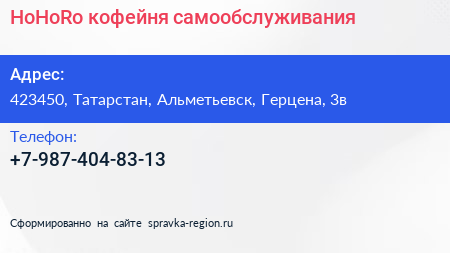 HoHoRo, кофейня самообслуживания по адресу 423450, Татарстан, Альметьевск, Герцена, 3в в дальнейшем Организация, размещена в следующих категориях: