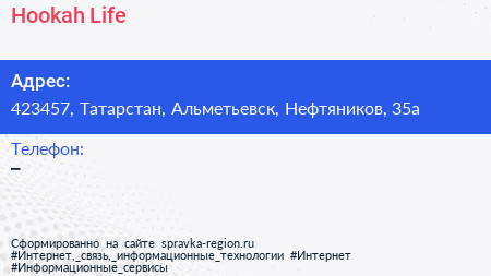 Hookah Life по адресу 423457, Татарстан, Альметьевск, Нефтяников, 35а в дальнейшем Организация, размещена в следующих категориях: