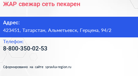 ЖАР свежар, сеть пекарен по адресу 423451, Татарстан, Альметьевск, Герцена, 94/2 в дальнейшем Организация, размещена в следующих категориях: