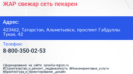 ЖАР свежар, сеть пекарен по адресу 423462, Татарстан, Альметьевск, проспект Габдуллы Тукая, 42 в дальнейшем Организация, размещена в следующих категориях: