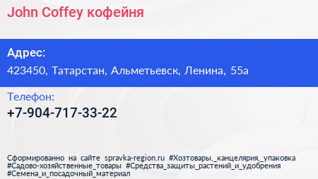 John Coffey, кофейня по адресу 423450, Татарстан, Альметьевск, Ленина, 55а в дальнейшем Организация, размещена в следующих категориях: