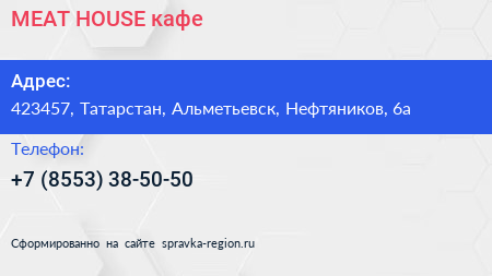 MEAT HOUSE, кафе по адресу 423457, Татарстан, Альметьевск, Нефтяников, 6а в дальнейшем Организация, размещена в следующих категориях: