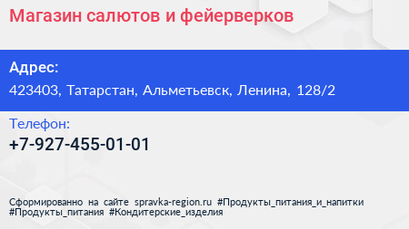 Магазин салютов и фейерверков по адресу 423403, Татарстан, Альметьевск, Ленина, 128/2 в дальнейшем Организация, размещена в следующих категориях: