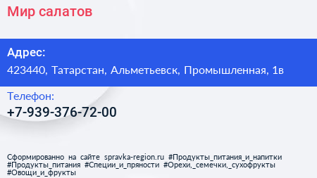 Мир салатов по адресу 423440, Татарстан, Альметьевск, Промышленная, 1в в дальнейшем Организация, размещена в следующих категориях: