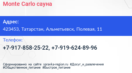 Monte Carlo, сауна по адресу 423453, Татарстан, Альметьевск, Полевая, 11 в дальнейшем Организация, размещена в следующих категориях: