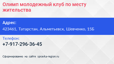 Олимп, молодежный клуб по месту жительства по адресу 423461, Татарстан, Альметьевск, Шевченко, 15Б в дальнейшем Организация, размещена в следующих категориях: