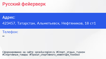 Русский фейерверк по адресу 423457, Татарстан, Альметьевск, Нефтяников, 18 ст1 в дальнейшем Организация, размещена в следующих категориях: