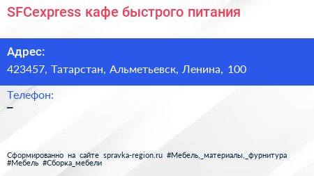 SFCexpress, кафе быстрого питания по адресу 423457, Татарстан, Альметьевск, Ленина, 100 в дальнейшем Организация, размещена в следующих категориях: