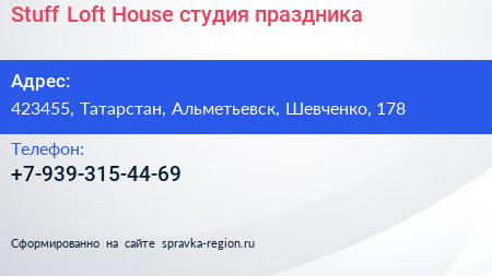 Stuff-Loft House, студия праздника по адресу 423455, Татарстан, Альметьевск, Шевченко, 178 в дальнейшем Организация, размещена в следующих категориях:
