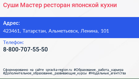 Суши Мастер, ресторан японской кухни по адресу 423461, Татарстан, Альметьевск, Ленина, 101 в дальнейшем Организация, размещена в следующих категориях: