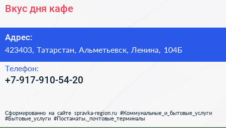 Вкус дня, кафе по адресу 423403, Татарстан, Альметьевск, Ленина, 104Б в дальнейшем Организация, размещена в следующих категориях: