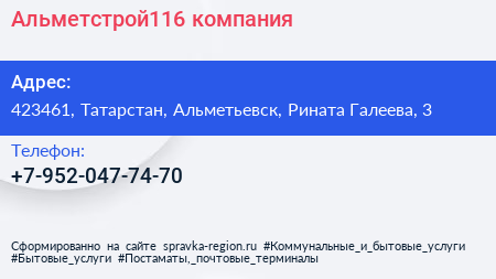 Альметстрой116, компания по адресу 423461, Татарстан, Альметьевск, Рината Галеева, 3 в дальнейшем Организация, размещена в следующих категориях:
