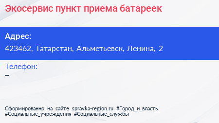 Экосервис, пункт приема батареек по адресу 423462, Татарстан, Альметьевск, Ленина, 2 в дальнейшем Организация, размещена в следующих категориях: